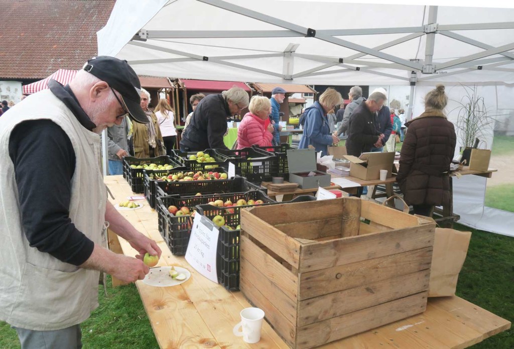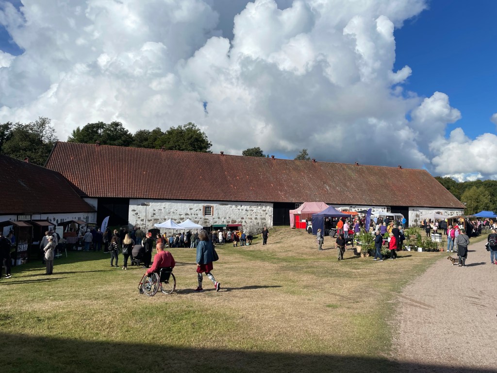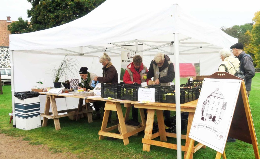 Ett stort antal försäljaren var tidigt på plats . Ett lätt duggregn som upphörde när besökarna började strömma till ! Hovdala vänner bidrog med bl.a. försäljning av närodlade ekologiska äpplen från Hovdala trädgård ! Bakbok,mynt och kanonkulor var också till försäljning ! Nytt för i år var ett lotteri med skänkta vinster från säljarna ! Ett stort tack för det ! Det blev en härlig dag med perfekt festväder . En succé som återkommer nästa år !