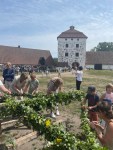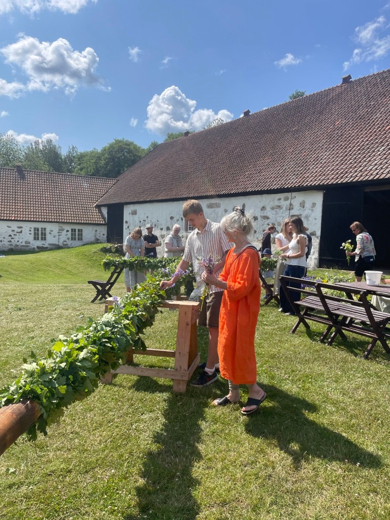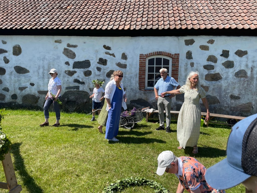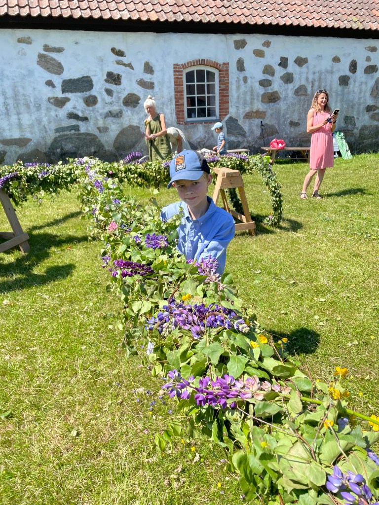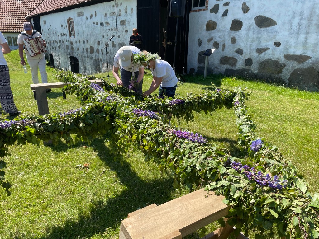 Vid lunchtid samlades vi på borggården för att blomsterklä midsommarstången som lövats kvällen innan av Hovdala vänner.